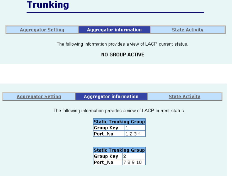 4. Work ports: Allow max four ports can be aggregated at the same time. If LACP static trunking