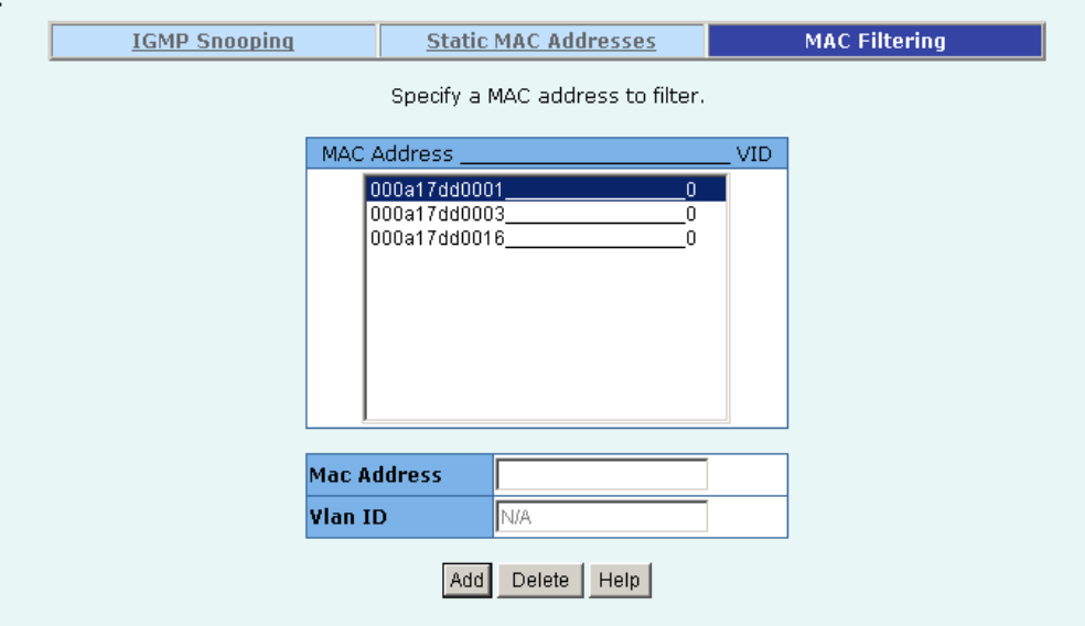 MAC address filtering allows the switch to drop unwanted traffic. Traffic is filtered based on the