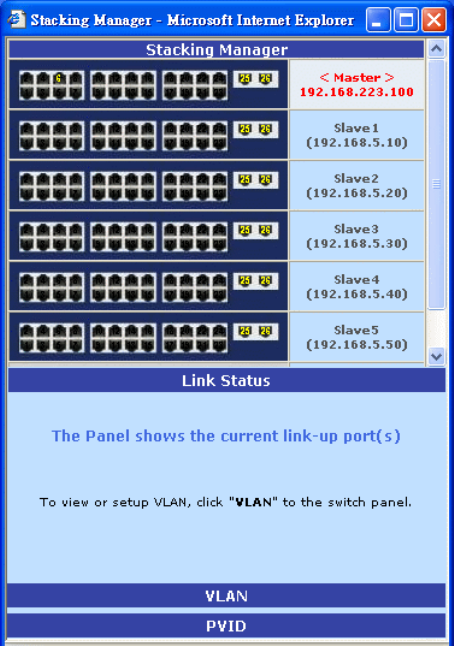 To configure the VLAN setting of the stacking switch, click "VLAN" to bring up the VLAN