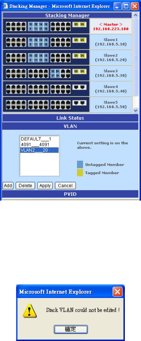 VLAN" are undeletable! A error message will pop up to cancel the task. Stack VLAN also can't be