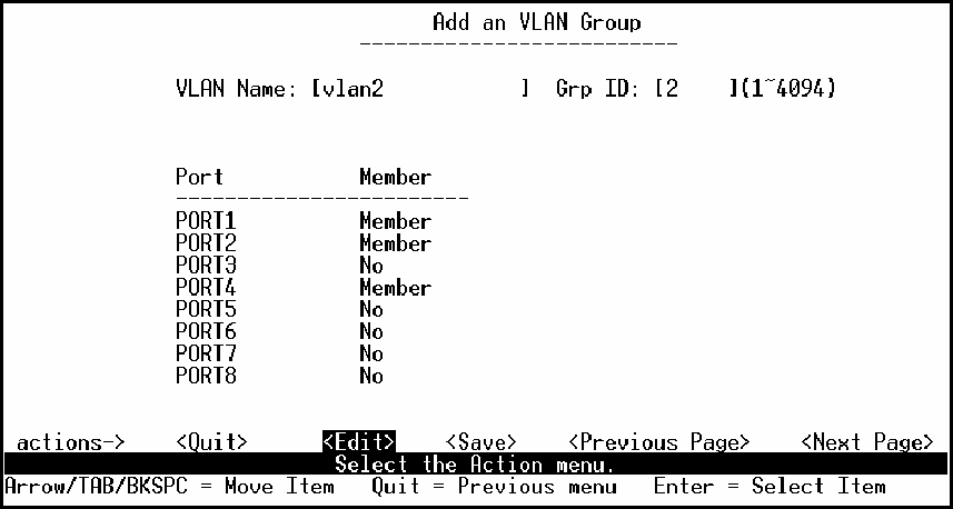 4. Member: Press <Space> key to choose VLAN member. There are two types to selected: