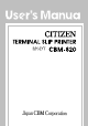 Declaration of Conformity Manufacturer’s Name : Manufacturer’s Address Declare the Product Product Name Model Number(s) Conform to the following Standards LVD EMC : Japan CBM Corporation : CBM Bldg., 5-68-10, Nakano, Nakano-ku, Tokyo, 164-0001, Japan Dot Matrix Printer CBM-820 Series (CBM-820R, CBM-820P) (S.No.