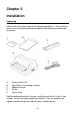Chapter 2 Installation Unpacking Check each of the items against the following packing list. If any of these items are missing, please contact the dealer from whom you purchased the printer. A B C D E Printer Driver Disk User Manuals (including this one) Ribbon cassette Printer Power Cord Hold the bottom of printer in the box, and then care fully lift it up. As you unpack, save all the original packing materials. They are specially designed to protect the printer and will make re-packing easy.