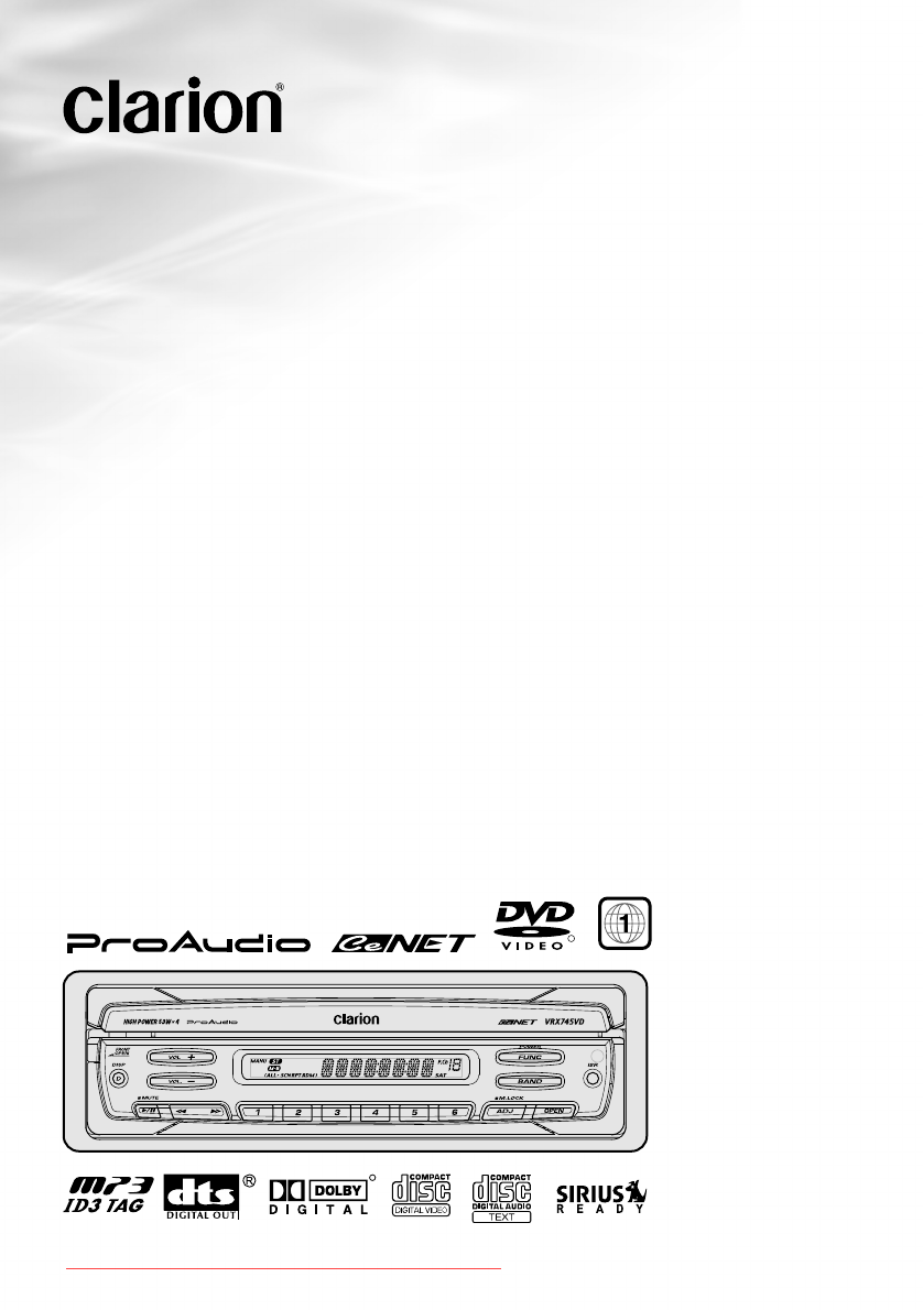 Thank you for purchasing the Clarion VRX745VD. ∗ This owner’s manual is for the VRX745VD. ∗ Please read this owner’s manual in its entirety before operating this equipment. ∗ After reading this manual, be sure to keep it in a handy place (e.g., glove compartment). ∗ Check the contents of the enclosed warranty card and keep it carefully with this manual. ∗ This manual includes the operating procedures of the CD changer, DVD changer, TV tuner, SIRIUS, 5.1ch surround decoder. The CD changer, TV tuner, 5.