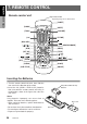 English 7. REMOTE CONTROL Owner’s manual Remote control unit Signal transmitter Operating range: 30˚ in all directions [CeNET] [BAND] [MUTE] [FUNC] [VOLUME] [P.TIME] [0-9] [ [DISC SEL] [ ],[ [SEARCH MODE] [MENU] [TITLE] [SET UP] [RPT] ] ] [RTN] [ ] [ [ENT] [ ],[ ] [SCAN] [ ],[ ] ],[ [RDM] [AUDIO] ] [PBC] [SLOW] [ANGLE] [SUB TITLE] Inserting the Batteries 1.Turn the remote control unit over, then slide the rear cover in the direction of the arrow. 2.