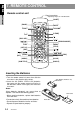 English 7. REMOTE CONTROL Owner’s manual Remote control unit Signal transmitter Operating range: 30˚ in all directions [CeNET] [BAND] [MUTE] [FUNC] [VOLUME] [P.TIME] [0-9] [ [DISC SEL] [ ],[ ] [ ] ] [SEARCH MODE] [RTN] [MENU] [SET UP] [TITLE] [ [RPT] [ENT] [ ],[ ] [SCAN] [ ],[ ] ],[ [RDM] [AUDIO] ] [PBC] [SLOW] [ANGLE] [SUB TITLE] Inserting the Batteries 1.Turn the remote control unit over, then slide the rear cover in the direction of the arrow. AA (SUM-3, IECR-6/1.
