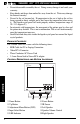 OWNER’S MANUAL REAR CONTROLS q w e r t AND CONNECTOR LOCATIONS: VGA Input Connector S-Video Input Connector Composite Video Input RS232 Port (Not Available) y DC Input Connector +12Vdc u Power Switch 110Vac 50-60 Hz. i AC Input Connector 110Vac 50-60 Hz. o L/R Audio Input Connectors USB Input Connector OPERATION DESCRIPTIONS: When using this monitor in a 110Vac home environment. Plug the monitor into a 110Vac wall socket with the supplied AC power cable.