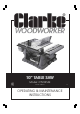 Thank you for purchasing your new CLARKE 10” TABLE SAW which is designed for DIY and hobby use ONLY Before attempting to operate this machine, please read this instruction manual thoroughly and follow all directions carefully. In doing so you will ensure the safety of both yourself and others around you and, at the same time you should look forward to the machine providing long and trouble free service. GUARANTEE This product is guaranteed against faults in manufacture for 12 months from purchase date.