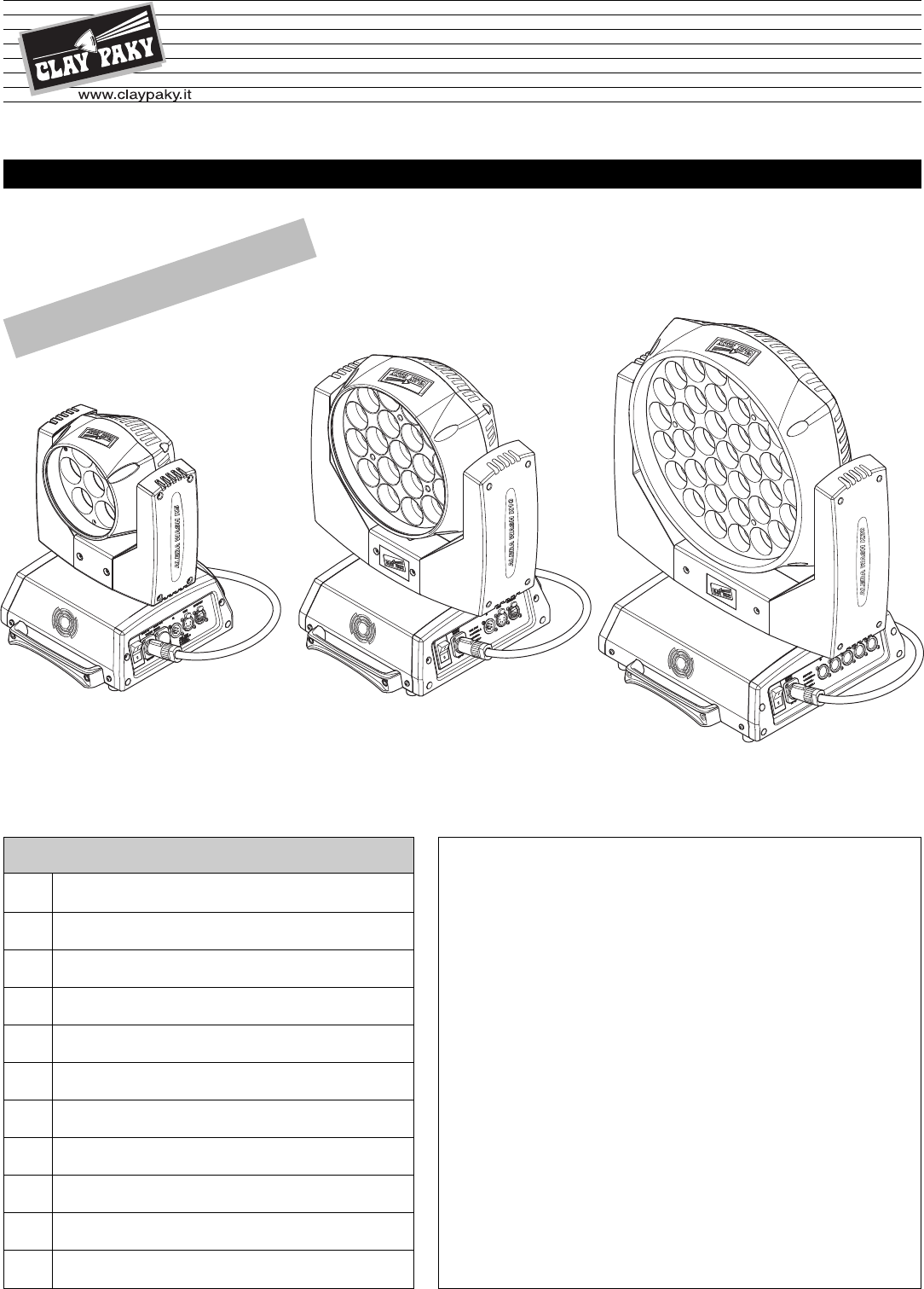ENGLISH A.LEDA WASH K5 A.LEDA WASH K10 A.LEDA WASH K20 ® C61401 C61405 C61410 INSTRUCTION MANUAL PR ARY N I M ELI INDEX Page Contents 2 Safety information 3 Unpacking and preparation 4 Installation and start-up 5 Control panel 7 Menu setting 14 Maintenance 16 Optional accessories 19 Technical information 19 Cause and solution of problems 20 Channel functions Congratulations on choosing a Clay Paky product! We thank you for your custom.