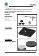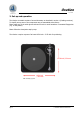Ovation User manual 2. Set-up and operation The Ovation -turntable consists of several elements, as described in section 1 (Packing overview). To simplify set up some of the components are pre-assembled at the factory. Please make use of the white gloves enclosed in order to avoid scratches or unwanted fingerprints (e.g. on the platter). Please follow the description step by step: The Ovation requires a space of at least 16.54 inch x 13.78 inch for positioning. 13.78 inch / 350 mm 16.