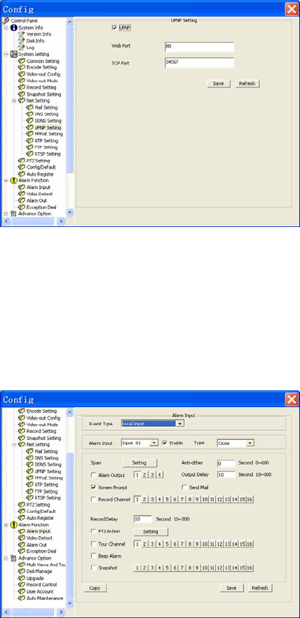 User can set alarm input, alarm output, video detect and exception deal. There are