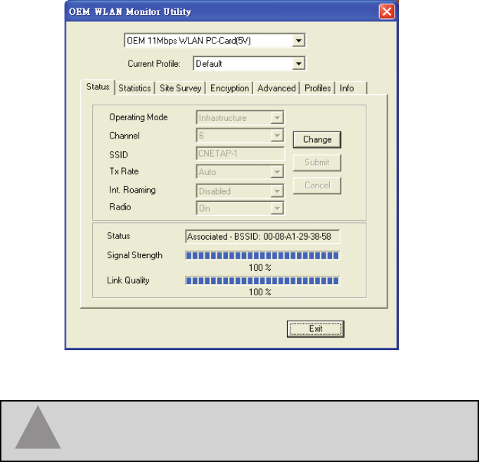 The Change bottom, allows you to customize the setting for the WLAN PC Card and your