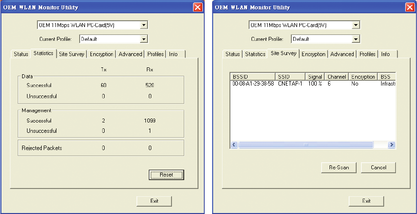Click on the desired access point / station. Then double click BSSID to connect or Re-Scan to