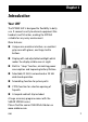 Introduction Performance For best performance of the transceiver keep the following in mind: • Keep clear of metal environment. • Hold the transceiver vertically and 5 cm from lips and push the PTT when transmitting. • In receive mode carry the transceiver vertically with belt clips. • To preserve battery power, adjust squelch to close the loudspeaker when there is no signal. • If you are in a lifeboat keep the antenna as high as possible.