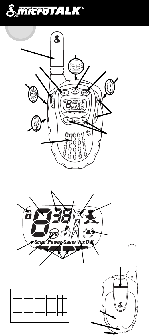 Two-Way Radio Model MT 725 ENGLISH External Speaker/ Microphone Jack Antenna LOCK Button CALL Button MODE Button POWER Button Charge/Intercom Jack TALK Button VOLUME CONTROL Buttons LIGHT/MAX RANGE Button CHANNEL SELECT Buttons Speaker/Microphone CTCSS Privacy Code Numbers Receive/Transmit Keystroke Tone Main Channel Number Lock Baby Monitor VibrAlert®/Call Alert Scan Roger Beep Dual Watch Battery Level Indicator VOX Power Saver This equiment is intended for use in: AT BE CY CZ DE DK •
