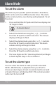 Mode Alarme 1. Appuyez sur la touche MODE et maintenez-la enfoncée jusqu’à ce que l’écran affiche le type d’alarme (iPod, FM, AM ou BIP). 2. Appuyez sur la touche MODE jusqu’à ce que vous obteniez le type d’alarme souhaité. Attendez que le voyant d’affichage s’arrête de clignoter, ce qui indiquera que le type d’alarme est configuré. Vous pouvez aussi sélectionner le type d’alarme en appuyant sur le bouton ALARM MODE de votre télécommande.