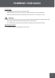 POWERING YOUR RADIO AC Operation • Plug the power cord into an AC 120V wall outlet. • Locate the Main Power switch on the rear of the unit and set it to the ON position. • Press the Volume/Power knob on the front of the unit to turn your stereo on or off. WARNING: • Do not connect the power plug to a power outlet other than that which is indicated here and on the label as this may result in the risk of fire or electric shock. • Do not handle the power plug with wet hands.