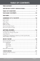 TABLE OF CONTENTS PRECAUTIONS.................................................................. 2 IMPORTANT SAFETY INSTRUCTIONS............................... 4 TABLE OF CONTENTS........................................................ 7 PACKAGE CONTENTS.................................................... 10 FEATURES........................................................................ 11 CONTROLS AT A GLANCE............................................. 12 Front View........................................