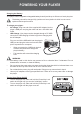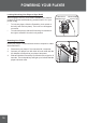 POWERING YOUR PLAYER Charging the Battery Your player has an integrated rechargeable battery that will provide up to 20 hours of music play time. The battery should be charged fully (minimum 4 hours) before its initial use to ensure optimum lifetime performance. To charge your player: • AC Charge: Plug one end of the supplied AC Adapter into the player’s USB port and plug the other end into a 100-240V wall outlet. • USB Charge: Your player can be charged through a PC USB connection.