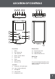 LOCATION OF CONTROLS 13 12 11 14 10 9 15 16 BOTTOM TOP 1 2 7 3 5 6 4 8 FRONT BACK 17 Front View Bottom View 1. Menu 14. DC 5V Power Jack 2. Up / Volume Up 15. USB-MSC Port 3. Left / Previous 16. USB-MTP/HOST Port 4. Down / Volume Down 5. Right / Next 6. Enter 7. Play / Pause 8. Record / A-B Top View 9. Back View 17. Reset To use the touchpad interface, press lightly on the red-lit markings to activate the control. Power On / Off (slide right) 10.