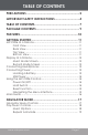 TABLE OF CONTENTS PRECAUTIONS.................................................................. 2 IMPORTANT SAFETY INSTRUCTIONS............................... 4 TABLE OF CONTENTS........................................................ 7 PACKAGE CONTENTS...................................................... 9 FEATURES........................................................................ 10 GETTING STARTED.......................................................... 11 MP-C896 at a Glance......................