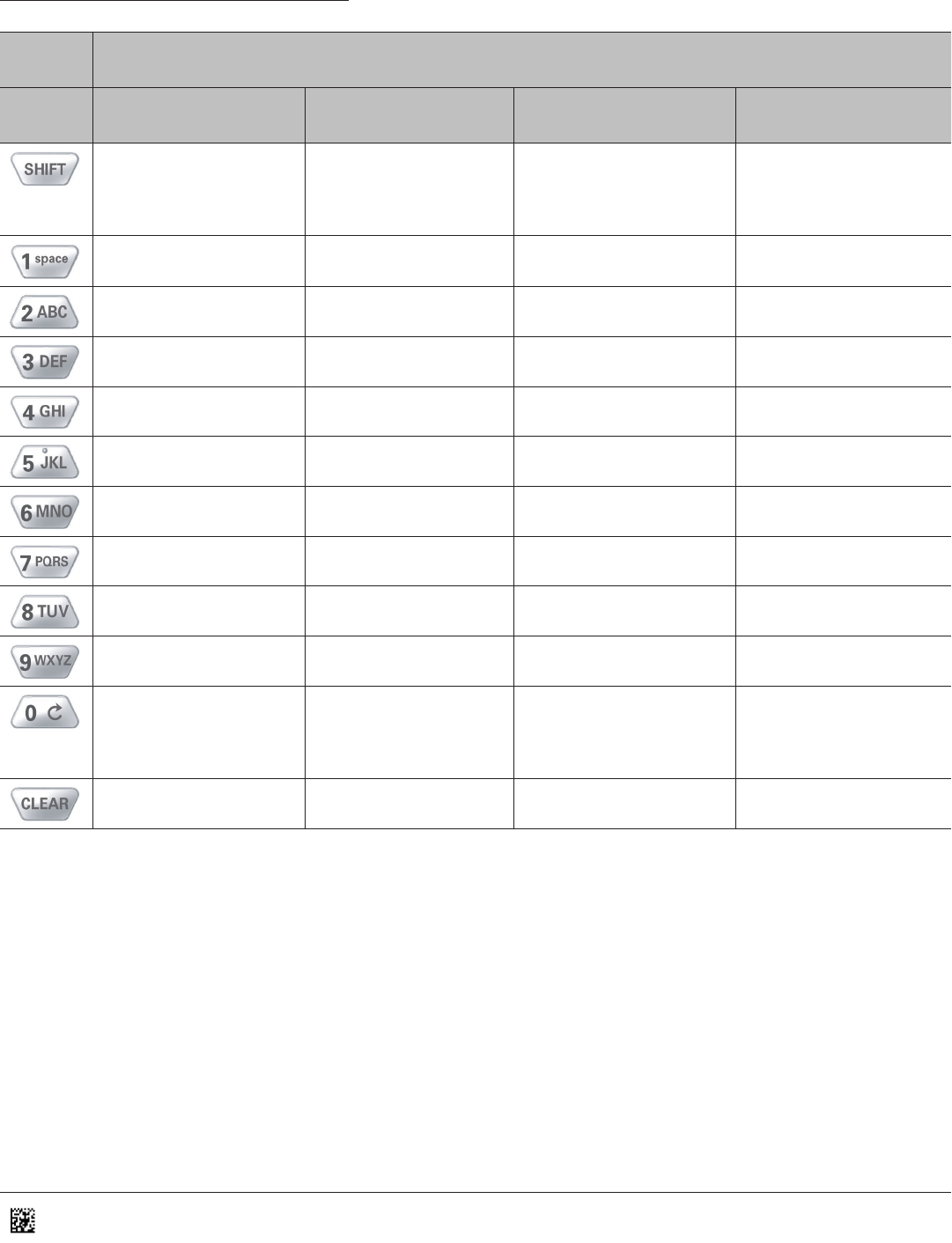 Key Numeric Mode Upper Case Text Mode Lower Case Text Mode Symbol Mode