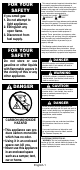 PARA SU SEGURIDAD Si usted huele gas: 1. No intente encender el aparato. 2. Extinga cualquier llama abierta. 3. Desconecte el suministrador de combustible. PARA SU SEGURIDAD No almacene o use gasolina u otros líquidos que contengan vapores inflamables cerca de este o cualquier otro aparato. PELIGRO RIESGO DE MONOXIDO DE CARBONO • Este aparato puede producir monóxido de carbono el cual no tiene olor. • Usarlo en un área cerrada puede causarle la muerte.