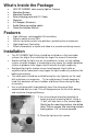 What’s Inside the Package LED XP-2H38WC solar security light w/ Camera Mounting Screws Mounting Template Solar charging panel with 15’ Cable Receiver A/C Adapter (Receiver) Audio/Video connecting cables Owner/Installation Manual Features High efficiency, rechargeable Lithium battery. Detects motion at over 30 ft. Lithium-ion battery emits zero pollution, protecting the environment. High brightness illumination. Wireless broadcast of audio and video to a remote monitoring source.