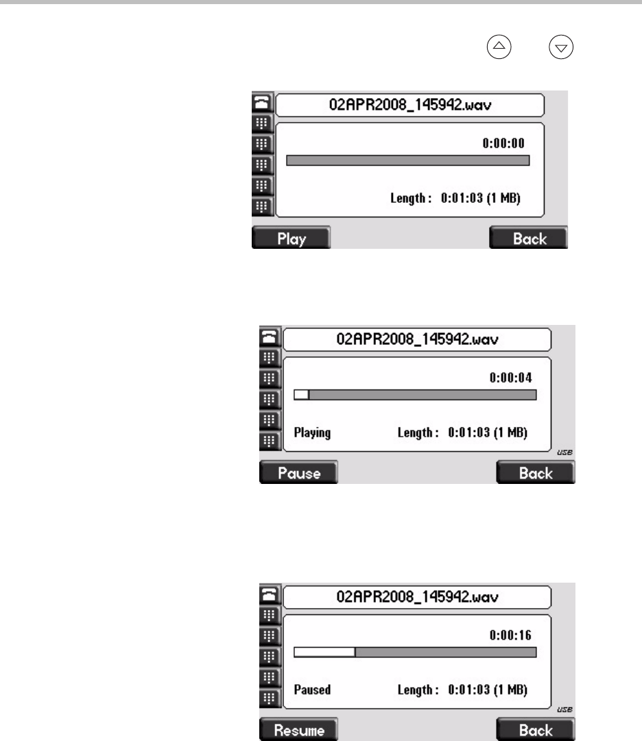 (Optional.) Press the Pause soft key to pause the file playback.