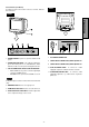 2 PART NAME ENGLISH Control Names (17" & 19" Models) See figures below for the location of the user controls, indicator and connectors. Each part is identified by number and is described individually. REAR FRONT D-SUB D-sub 7. AC POWER CONNECTOR 1. POWER SWITCH: A push-on / push-off switch for AC power. 8. SIGNAL INPUT CONNECTOR (DB9-15P) 2. POWER-ON INDICATOR: This indicator illuminates green when AC power is on, and illuminates amber when the monitor is in the power management modes. 3.
