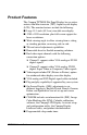 Product Features The Compaq TFT8030 Flat Panel Display has an active matrix, thin-film transistor (TFT), liquid crystal display (LCD). The monitor features include the following: ■ Large 18.1-inch (45.9 cm) viewable area display. ■ 1280 × 1024 resolution, plus full-screen support for lower resolutions. ■ Wide viewing angle to allow viewing from a sitting or standing position, or moving side-to-side. ■ Tilt and swivel adjustment capabilities. ■ Removable base for flexible mounting solutions.