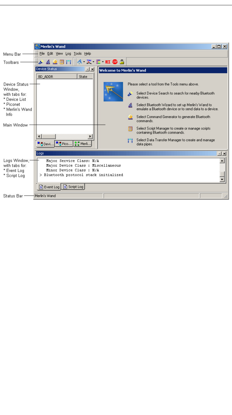 • The Main window, where the primary tools are run: Bluetooth