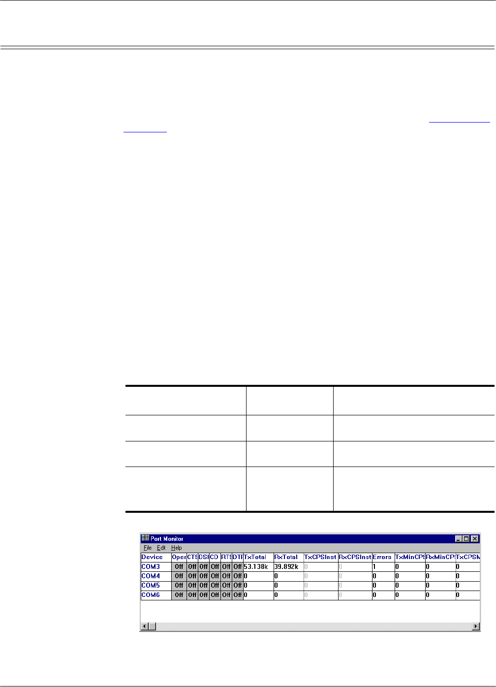 The Port Monitor display follows the familiar spreadsheet model: each COM port
