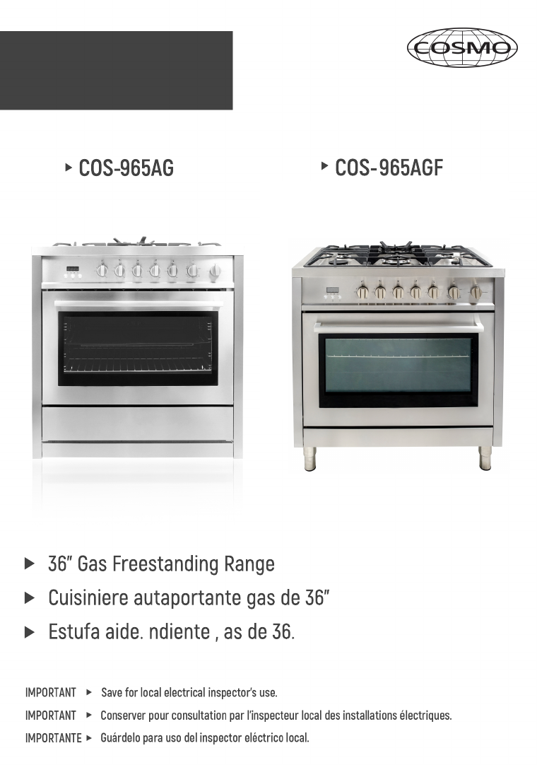 LP/PROPANE GAS CONVERSION This appliance can be used with Natural Gas or LP/Propane gas. It is shipped from the factory for use with natural gas. A kit for converting to LP gas can be purchased separately from www.cosmoappliances.com. When the cooktop is converted for liquid petroleum (LP) gas, the LP gas supply is required to provide a minimum of 10" to a maximum of 14" water column to the cooktop regulator.