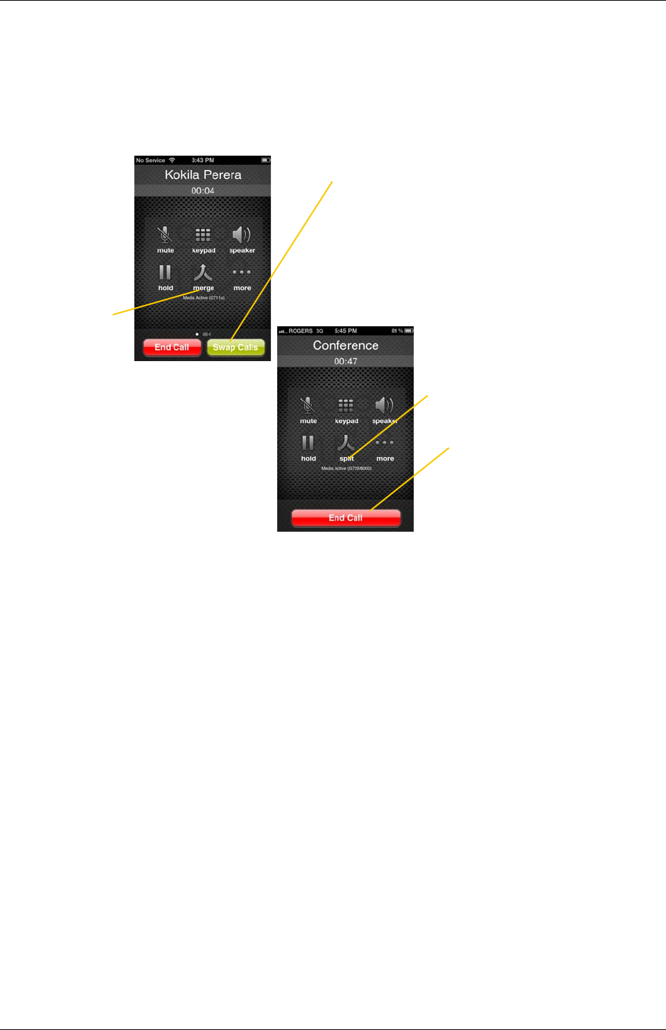When you have two Bria calls established, you can merge the calls into a three-way conference call.