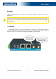 Start Guide 3. Power The router requires an external DC power supply. The DC voltage required is between +9 and +48 V DC. The router has built-in protection against reverse polarity without signaling. Connect the power supply cable to the PWR connector on the left panel of the router (see the figure below) and tighten the locking screws. 4. Ethernet For an initial configuration, made in a web browser, connect a PC by an Ethernet cable to the default LAN interface, use the ETH0 port, see the figure above.