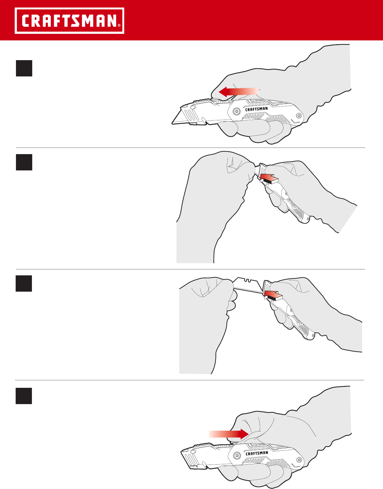 BLADE CHANGE INSTRUCTIONS 1 EXTEND SLIDER 2 PUSH AND HOLD BLADE CHANGE BUTTON, PULL BLADE OUT 3 PUSH AND HOLD BLADE CHANGE BUTTON, INSERT NEW BLADE 4 RETRACT THE SLIDER