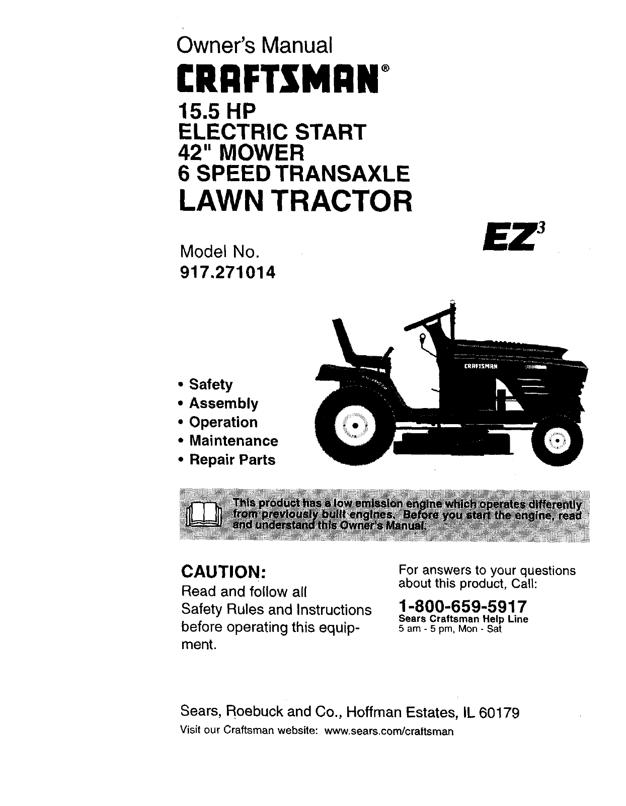 Owner's Manual CRAFTS[MAN + 15.5 HP ELECTRIC START 42" MOWER 6 SPEED TRANSAXLE LAWN TRACTOR Model No. 917.271014 • • • • Safety Assembly Operation Maintenance • Repair Parts CAUTION: For answers to your questions about this product, Call: Read and follow all Safety Rules and Instructions before operating this equipment 1-800-659-5917 Sears Craftsman Help Line 5 am - 5 pro, Mon - Sat Sears, Roebuck and Co., Hoffman Estates, IL 60179 Visit our Craftsman website: www.sears.