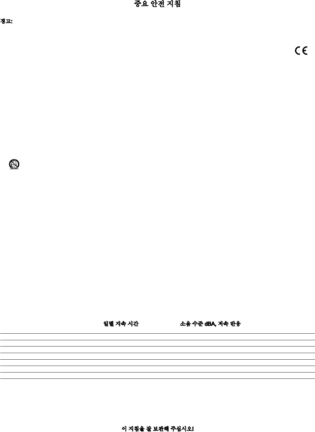 노출되는 경우 영구적인 청각 손상을 예방하려면 이 앰프 시스템 사용 시 귀마개 또는 귀 전체를 덮는 보호구를 착용해야 합니다. 잠
