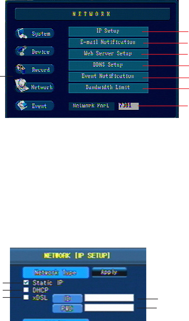 parts - the network connection type and the TCP/IP information. Select the Network type. e DVR sup-