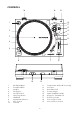 CONTROLS 15 16 16 1 14 17 13 2 12 11 3 10 4 9 5 6 7 18 1 2 3 4 5 6 7 8 9 10 8 19 45 RPM Adaptor Turntable Platter Spindle Strobe Dots On/Off Switch Start/Stop Button Headshell Speed Select Buttons Pitch Control Tonearm 11 12 13 14 15 16 17 18 19 2 Tonearm Rest and Hold Down Clip Cue Lever Anti-skate Knob Counterweight Spare Headshell Holder Hinges for Turntable Lid Downforce Scale Line out/Phono Jack Line out/Phono Switch