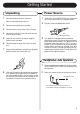 Turntable Operation Turntable Operation Turn the unit on by pressing the POWER BUTTON (13) located on the front panel. 1 Slide the FUNCTION SWITCH (8) to the PHONO position. 2 Set the SPEED CONTROL SWITCH (34) to the desired speed (33 1/3, 45 or 78 rpm). Place the record on the turntable. 3 Pull the TONE ARM (33) slightly to the right side until hear the “click” sound to activate the TURNTABLE (31). 4 Move the TONE ARM (33) by hand to the record and slowly lower it to the desired starting point.
