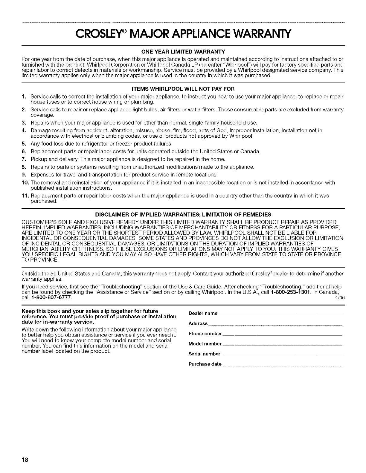CROSLEY MAJOR APPLIANCEWARRANTY