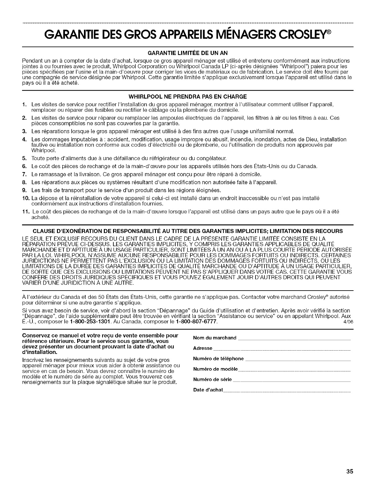 /_,I'exterieur du Canada et des 50 12tatsdes 12tats-Unis, cette garantie ne s'applique pas. Contacter votre marchand Crosley ®autorise