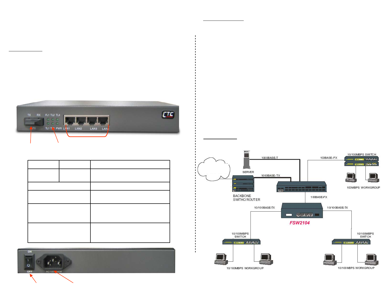 The FSW2104 is an unmanaged 4 port 10/100 switch with one 100Base-FX Fiber uplink.
