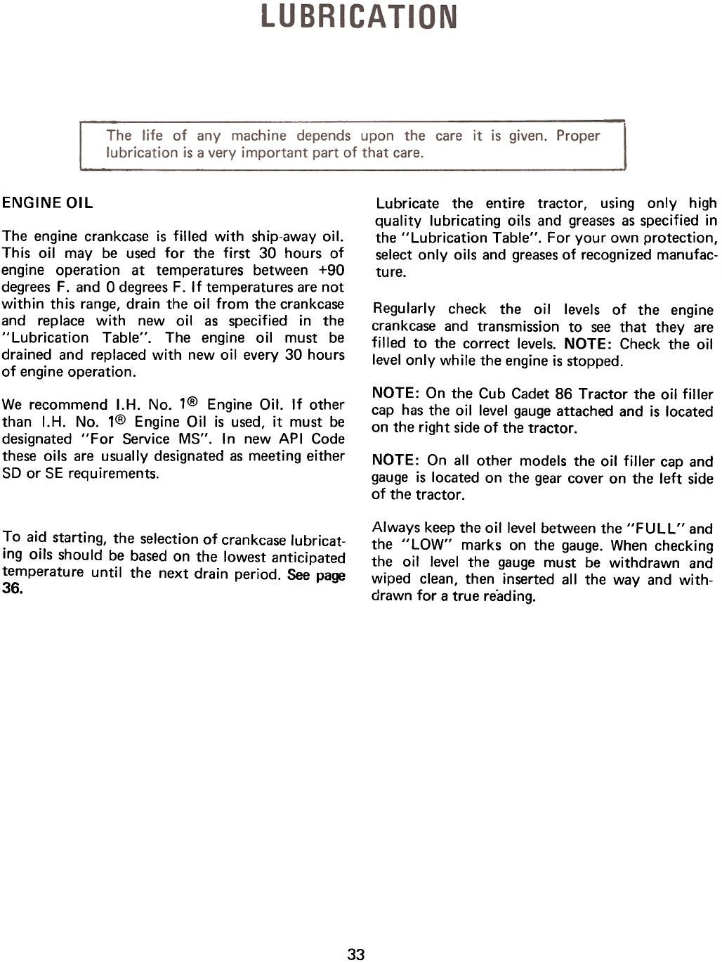 NOTE: On the Cub Cadet 86 Tractor the oil filler