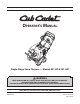 Safe Operation Practices • Set-Up • Operation • Maintenance • Service • Troubleshooting • Warranty Operator’s Manual Single-Stage Snow Thrower — Models 221 HP & 221 LHP WARNING READ AND FOLLOW ALL SAFETY RULES AND INSTRUCTIONS IN THIS MANUAL BEFORE ATTEMPTING TO OPERATE THIS MACHINE. FAILURE TO COMPLY WITH THESE INSTRUCTIONS MAY RESULT IN PERSONAL INJURY. CUB CADET LLC, P.O. BOX 361131 CLEVELAND, OHIO 44136-0019 Printed In USA Form No.