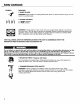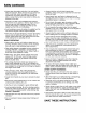 Safety (continued) • Always stop the engine and allow it to cool before filling the fuel tank. Never remove the cap of the fuel tank, or add fuel, when the engine is hot. Never operate the unit without the fuel cap securely in place. Loosen the fuel tank cap slowly to relieve any pressure in the tank. • Add fuel in a clean, well-ventilated area outdoors where there are no sparks or flames. Slowly remove the fuel cap only after stopping engine. Do not smoke while fueling or mixing fuel.