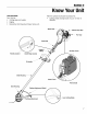 Section 2 KnowYourUnit APPLICATIONS As a trimmer; With the optional brushcutter accessory kit; • • Cutting grass and weeds. • Edging • Decorative trimming around trees, fences, etc. Cutting weeds and light bush of up to 1/2 inch in diameter. Spark Plug _Starter Rope Grip Fuel Cap Shaft Grip Support Fitting Throttle Control Air Filter Cover On/Off Stop Control Shaft Housing Choke Lever Primer Bulb Gear Housing \ Cutting \ \ Attachment Shield \ \ \ Line Cutting Blade g Attachment 7