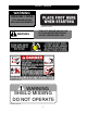 SAFETY LABELS WARNING OPEN BELT DRIVE STOP ENGINE BEFORE REACHING UNDERNEATH Part Number: 01001035 WARNING Part Number: 777I22931 - TURN OFF ENGINE AND ALLOW TO COOL BEFORE REFUELING. - DO NOT SMOKE NEAR FUEL.